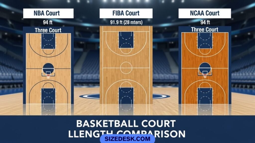 An official basketball court is 94 feet long. That means 100 feet is slightly longer than a full court.